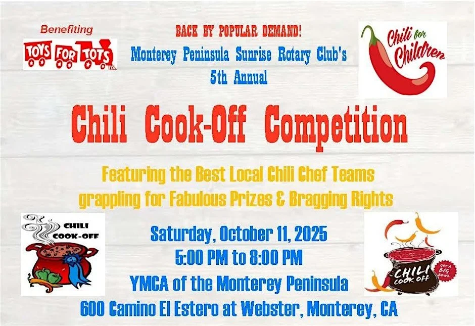 Rotary Club of Carmel-by-the-Sea will be participating in a Chili Cook-off Competition hosted by Monterey Peninsula Sunrise Rotary Club, benefitting Toys for Tots!